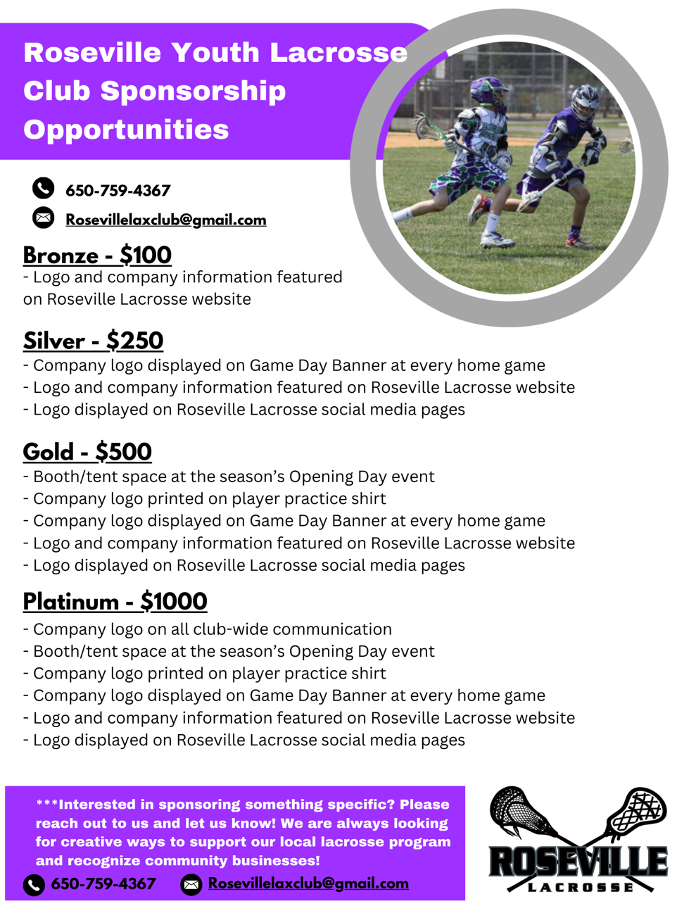 We are currently seeking sponsors for our 2026 spring lacrosse season. If you or your business is interested in supporting our youth lacrosse club, please reach out to us! Info is below. Thank you!